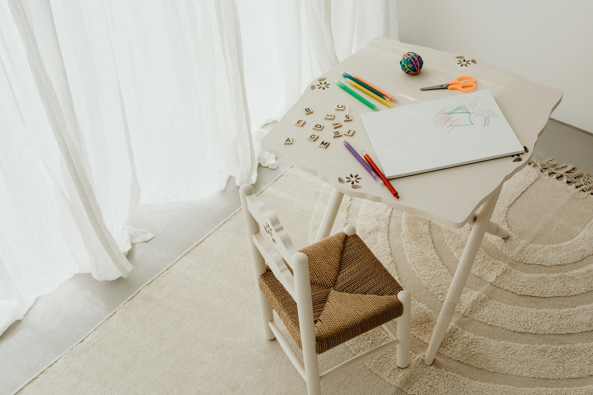 Stolen har en højde, der passer til Mads børnebordet, og sammen udgør de et praktisk sæt til leg, tegning og kreative aktiviteter. Den enkle konstruktion og glatte overflade gør den nem at rengøre med en hårdt opvredet klud og mildt sæbevand.